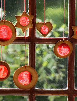 Verwarm de oven voor op 180˚ C. Kneed alle ingrediënten behalve de zuurtjes met de hand of in de keukenmachine snel tot een soepel deeg. Laat het deeg in een plastic zak in de koelkast circa 30 min. rusten. Stamp de zuurtjes met een deegroller in de papiertjes kapot. Rol het deeg uit tot circa 1 cm dik. Teken met de hand de vormen van de koekjes op bakpapier en knip de vormpjes uit. Leg de vormpjes op het deeg en snijd de koekjes in vorm. Snijd nu een deel van het midden er uit. Maak een gaatje boven in het koekje om het straks op te kunnen hangen. Leg de koekjes op een bakplaat bekleed met bakpapier en bak ze in circa 10 min. in het midden van de oven bijna gaar. Verdeel de kruimels van 1 snoepje in het midden van de koekjesvorm en bak de koekjes nog circa 2 min. Het zuurtje zal smelten. Blijf bij de oven en haal de koekjes eruit zodra het zuurtje gesmolten is. Als het te lang doorbakt verliest het zijn kleur. Roer een dik glazuur van het eiwit, de poedersuiker en het citroensap (of gebruik een kant-en-klaar glazuur). Laat de koekjes goed afkoelen, spuit er met behulp van een spuitzakje met een heel dun spuitmondje eventueel letters op van glazuur en hang ze op.