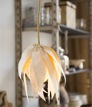 Werkwijze Knip een strook papier van 24 cm. Neem het patroondeel van het blad over. Vouw het papier meerdere malen dubbel, zodat het patroondeel van het blad er precies op past en er meerdere lagen ontstaan, waaruit in een keer meerdere blaadjes geknipt kunnen worden. Knip in totaal 19 blaadjes. Neem een stukje ijzerdraad en rijg, door de aangegeven punten, hier 9 blaadjes aan. Schuif de blaadjes dakpansgewijs over elkaar. Buig het ijzerdraad dicht, zodat het om de fitting past. Schroef vast met de lampenkapring. Deze zorgt ervoor dat de blaadjes enigszins afstaan en niet direct op de gloeilamp hangen. Buig de blaadjes een beetje bol. Maak nog een ring met 10 blaadjes en schuif deze om het snoer heen, zodat hij over de vorige ring heen valt. Buig ook deze blaadjes weer iets bol.