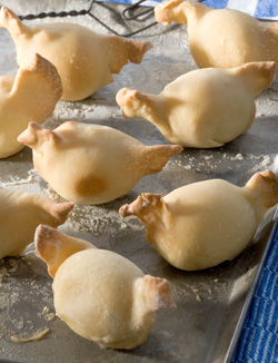De kip is natuurlijk bij uitstek hét paasbeest. Deze kippen hebben in hun bolle buikje een eitje verstopt. Leggende kipjes met kaas en ham