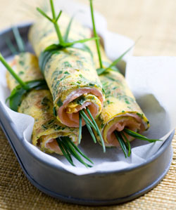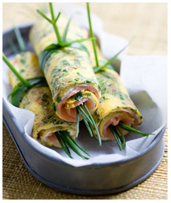 Bereidingswijze Roer de eieren, bloem, melk en Spa rood in een kom tot een glad deeg. Voeg zout en peper toe naar smaak. Was de kruiden, snijd ze fijn en roer ze door het beslag. Verhit boter of olie in een flensjespan en bak kleine pannenkoekjes. Bewaar ze in een stapel op een bord. Besmeer ze dun met crème fraiche of roomkaas en beleg ze met plakjes zalm. Leg een bosje bieslooksprietjes in het midden en rol ze op tot wrap. Bind ze samen met een strip daslookblad en steek er een prikker in. Snijd ze in stukjes voor bij de borrel.