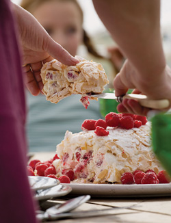Verwarm de oven voor tot 200 ºC. Bekleed een bakplaat (of lage bakvorm) met vetvrij papier en vet het papier licht in. Klop de eiwitten in een schone, droge kom zeer stijf. Voeg de suiker lepel voor lepel toe en klop tussendoor stevig. Blijf kloppen tot het mengsel dik en glanzend is. Spreid het stijve eiwit uit over het bakblik en bestrooi het met geschaafde amandelen. Bak het geheel 8 minuten boven in de voorverwarmde oven. Zet de oven op 160 ºC en bak de meringue goudbruin; bak hem niet te lang, anders is hij moeilijk op te rollen. Keer de meringue om op een vel vetvrij papier. Verwijder het papier van de meringue en laat hem 10-15 minuten afkoelen. Klop de room stijf en meng er voorzichtig de helft van de frambozen door. Verdeel de room en de frambozen gelijkmatig over de meringue. Begin bij de brede kant en rol met behulp van het vetvrije papier de meringue vrij strak op. Wikkel de rol in bakpapier en bewaar hem in de koelkast. Verwijder voor het serveren het papier en verdeel de resterende frambozen over de rol.