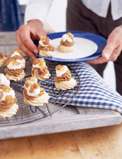 Klop de mascarpone met de crème fraîche en de vanillesuiker. Verdeel de kastanjepuree over de schuimpjes en spuit of schep er het mascarponemengsel over. Garneer met hele of gehakte marrons-glacés.