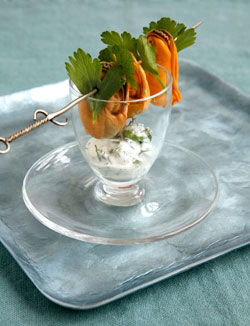 Steek aan een mooi prikkertje telkens 2 mosselen en 3 blaadjes selderij. Snijd de dille, peterselie en bieslook heel fijn en klop er een sausje van met de mayonaise, yoghurt, mosterd en mierikswortel. Verdeel de saus over 6 kleine glaasjes en leg er een spiesje op.