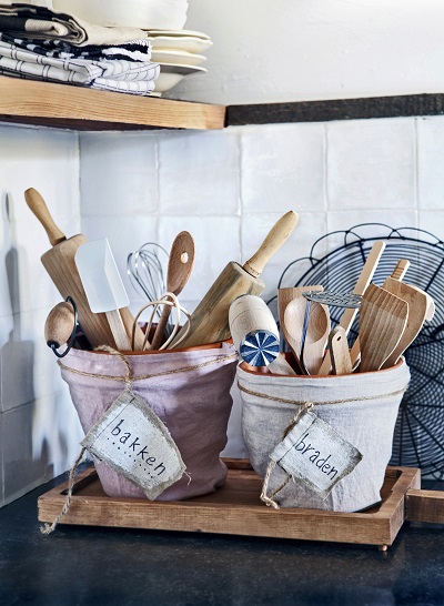 Heb je nog een stel bloempotten over of plaats je het keukengerei liever rechtop? Dan is dit een gemakkelijke manier om je keukenlade eens op te ruimen. Wat heb je nodig *2 terracotta potten *lap linnen *spelden *schaar *touw *stift Hoe maak je het