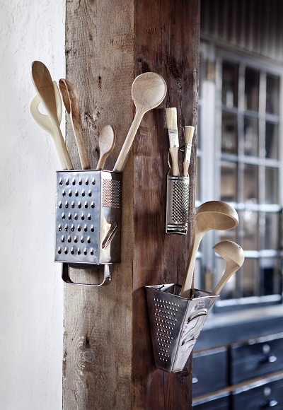 Als je (oude) raspen over hebt, of van een industriële uitstraling houdt dan is deze opbergmethode heel handig. Twee vliegen in één klap: pollepels en spatels bij de hand en leuke decoratie voor je keuken. Wat heb je nodig *raspen (bijvoorbeeld van de kringloopwinkel) *boormachine en ijzerboortje *spijker of schroef met plug Hoe maak je het