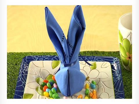 De broodjes zijn gebakken, de eieren gekookt, de brunch is bijna klaar. Nu de servetten nog! Volg de tekeningen en vouw een linnen servet tot een paaskonijn. Katjestakken vormen de staart. Werkbeschrijving 1. Neem een vierkant servet. Linnen leent zich het beste voor vouwen van vormen, eventueel kunt u het verstevigen met stijfsel. 2. Vouw het servet dubbel 3. Vouw nogmaals in de lengte dubbel, hou de opening aan de onderkant. 4. Vouw de rechter boven- en onderkant om waarbij ze op het middelpunt samen komen. 5. Vouw de linker punt, aan de onderkant omhoog naar het midden toe. 6. Doe dit ook met de rechter punt 7. Vouw de linker punt om naar het midden 8. Doe dit ook met de rechter punt 9. Draai het servet om 10. Vouw de bovenste punt om naar voren tot het midden 11. Draai de servet om 12. Vouw de rechterzijde in de lengte, iets over het midden heen. 13. Vouw de linker kant ook om, iets over het midden heen en steek de zijdes in elkaar. 14. Zet de servet recht op en spreid de bodem iets uit waardoor het stevig staat. Vouw de oren iets meer uit waardoor ze iets losser en voller komen te staan. 15. Steek een kort takje met wollige katjes in de servet.