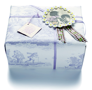 Werkwijze Pak het cadeautje zorgvuldig in. Knoop er een geruit lint omheen. Knip een cirkel van een portretfoto of -kaart en versier hem met een bandje van bloemen. Plak aan de achterkant twee stukken breed geruit lint en knip ze schuin af. Bevestig dit ‘corsage’ op het cadeau. Hang een mooi label aan het pakje. Styling, idee en uitvoering Susanne Houx