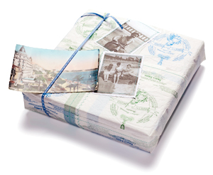 - Pak het cadeautje in en versier het verder met een gestipt lintje en een mooie oude ansichtkaart.