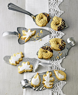 Verwarm de oven voor op 180 °C. Maal 50 gram van de noten, hak de rest grof. Klop de boter met de suiker en het zout in een kom met de elektrische mixer romig. Klop er 1 voor 1 de eigelen door. Meng de bloem met het bakpoeder en de gemalen noten. Meng het bloemmengsel met het botermengsel en roer er de yoghurt door. Bekleed een bakplaat met bakpapier. Doe het deeg in een spuitzak met een gekartelde spuitmond. Spuit telkens rondjes (∅ 5 cm) op het bakpapier. Bak de koekjes in ca. 15 minuten gaar. Laat ze afkoelen. Smelt de chocolade au bain-marie of in de magnetron op 900 Watt (roer om de minuut door). Doop de koekjes een klein stukje in de chocolade en bestrooi met wat gehakte nootjes. Laat de chocolade hard worden.