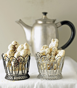 Verwarm de oven voor op 140 °C. Maal de pinda’s fijn. Klop met een elektrische mixer de eiwitten heel stijf. Voeg tijdens het kloppen beetje bij beetje de suiker toe. Meng de pinda’s met het kaneelpoeder. Schep dit mengsel voorzichtig door het eiwit. Doe het mengsel in een spuitzak met een ronde spuitmond en spuit de koekjes op een met bakpapier bekleedde bakplaat. Bak de koekjes in ca. 20 minuten gaar. Meng het cacaopoeder met de sinaasappelrasp en bestrooi de nog warme koekjes met het mengsel. Laat helemaal afkoelen.