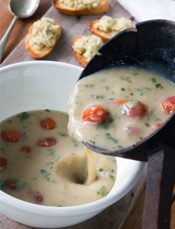 - Schep de soep in warme diepe borden. Bestrijk de crostini royaal met flageoletpuree en strooi het bieslook of de munt erover. Serveer de crostini bij de soep.