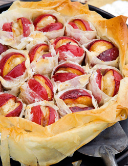 Nodig: springvorm van 26 cm doorsnede Ontdooi het fillodeeg volgens de gebruiksaanwijzingen op de verpakking. Verwarm de oven voor op 180˚ C. Snijd de pruimen doormidden en verwijder de pitten. Vul elke holte met een bolletje amandelspijs en druk de 2 helften weer op elkaar. Vet de springvorm in met wat van de gesmolten boter. Meng de citroenrasp door de rest van de gesmolten boter. Bestrijk 2 velletjes fillodeeg met wat -gesmolten boter met citroen en leg ze op de bodem van het bakblik. Strooi er wat amandelsnippers en wat -gember over. Bestrijk weer een velletje fillodeeg met wat gesmolten boter met citroen en strooi er wat amandelsnippers en wat gember over. Vouw het velletje dubbel en wikkel er een pruim in. Laat de bovenkant van de pruim vrij. Zet de pruim in de springvorm. Doe hetzelfde met de rest van de pruimen. Sprenkel er de rest van de boter en de suiker over en bak de taart in het midden van de oven in 25-30 minuten gaar. Lekker met zure room.