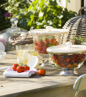 Werkwijze: Spuit de houten knopjes wit en schuur ze na drogen een beetje op zodat de knopjes er een beetje sleets uitzien. Boor indien nodig een gaatje voor in het midden van de onderzetters en schroef de knopjes erop vast. U heeft nu handige deksels om schalen met salade af te dekken zodat vliegen er niet bij kunnen komen.