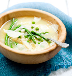 Bereiden Smelt de boter in een soeppan en bak de sjalotjes op laag vuur. Ze moeten zacht worden, niet bruin. Voeg de rijst toe en roer tot alle korrels met een laagje boter bedekt zijn. Schenk beetje bij beetje al roerend de wijn erdoor tot al het vocht opgenomen is. Doe de kippenbouillon erbij en kook de soep ca. 15 minuten zachtjes. Snijd de uiteinden van de aspergetips af en doe de asperges en doperwtjes bij de soep. Laat de soep nog 2-3 minuten doorkoken. Serveer met de Parmezaan. Baldo-rijst voor de soep Baldo is een wat recentere geteelde rijstras, gekweekt uit de Arborio-rijst. Hij heeft een grote lange korrel die compact is en goed absorbeert. Geschikt voor uiteenlopende rijstgerechten als sla, toetjes en ideaal voor risotto met groenten. Kooktijd 15 minuten. De rijst is wat sneller gaar dan de Carnaroli en de Baldo en de korrel wordt iets minder romig als hij gekookt is. Voor een rijstsoep is deze rijst dus heel goed. In de Piemonte worden voor dit gerecht vaak de topjes van wilde asperges gebruikt. Daar wordt in de lente fanatiek naar gezocht in de velden en bermen.