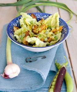 1 Verwarm de oven voor op 225 ºC. Boen de aardappelen schoon en snijd ze in partjes. Schep ze op de bakplaat om met een beetje olijfolie zodat ze rondom met een dunne laag zijn bedekt. Rooster de aardappelen in de voorverwarmde oven in 30-35 minuten goudbruin en gaar. Laat ze afkoelen tot lauwwarm. 2 Dop de kapucijners en doperwten. Kook ze samen in weinig water met zout in 2-3 minuten knapperig gaar. Giet ze af en spoel ze onder stromend water koud; laat ze goed uitlekken. 3 Snijd of scheur de gewassen Chinese kool klein. Verdeel het koolblad met de aardappelen, de kapucijners en de doperwten over 6 schaaltjes. 4 Boen de citroen schoon, rasp de helft van de gele schil eraf en pers de vrucht uit. Knip de malse stengels van de knoflookbollen in fijne ringetjes. Klop een dressing van de citroenrasp, 2 eetlepels citroensap, de knoflookringetjes, de olijfolie en versgemalen zout en peper. Sprenkel de dressing over de salade en hussel. Lekker met gegrilde koteletjes van het Mergellandlam.