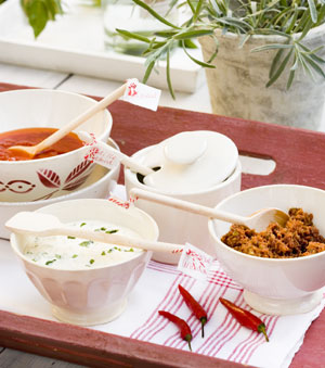 Benodigdheden: -mini pollepeltjes (Dille en Kamille) -heel dun houtboortje -rolladetouw (kookwinkel) -karton. Werkwijze: Scheur kleine labels uit het karton en schrijf daar de naam van de sausjes op. Bovenin de steel van de pollepeltjes boort u een gaatje. Haal hier een stukje rolladetouw doorheen en knoop hier een label aan vast. Plaats de lepels in de juiste saus en het is voor iedereen duidelijk wat er in de schaaltjes zit.