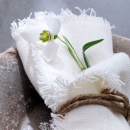 Knip een mooie linnen lap van 50×50 centimeter; afwerken is niet nodig, de rafelige rand geeft een nonchalant effect. Vouw de lap een aantal keer dubbel in de vorm van een servet en bind er een grof touw om. Vouw een flap van de stof terug en steek hier een sneeuwklokje tussen. Leg dit pakketje op een aardewerken bord in een afwijkende kleur voor een mooi contrast op tafel. Bord, € 16,50 (Aarde Werelds Wonen).