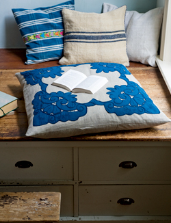 Nodig * Oud tafelkleed met mooie, opengewerkte hoeken * Dylon stofverf voor de wasmachine, kleur Jeans Blue 41 en Navy Blue 08 * Zout * Naturel Linnen 1,50 m x 1,50 breed (bij De Boerenbonthal) * Kussenvulling 75 x 75 cm Werkwijze Verven: Lees de gebruiksaanwijzing op de verpakking. Voor een intensere kleur gebruikt u de dubbele hoeveelheid verf. Verf volgens de gebruiksaanwijzing het tafelkleed. In elkaar zetten: * Knip uit het linnen een lap van 78 x 78, twee lappen van 71 x 78 cm. * Knip uit het tafelkleed de hoekpunten of andere mooie decoratie en leg deze op de lap van 78 x 78 cm. * Speld de applicaties op het linnen en stik rondom door. * Strijk de lappen van 71 x 78 cm 20 cm naar binnen, zodat een lap van 51 x 78 cm overblijft. * Leg de 2 lappen met de overslagen over elkaar heen, zodat een lap van 78 x 78 ontstaat. * Leg de 2 lappen met de verkeerde kanten van de overslagen (deze vallen straks naar binnen) naar buiten op de ‘verkeerde’ kant van de geappliceerde lap. * Speld de lappen op elkaar en stik rondom door met 1 cm naad. * Werk de zomen met een zigzagsteek af. * Knip de hoeken schuin af. * Keer de kussenhoes binnenstebuiten. * Stik op 2 plaatsen van de overslag 2 lintjes waarmee de kussenhoes dichtgestrikt kan worden.