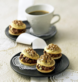 Hak de chocolade grof. Breng samen met de boter en de slagroom aan de kook. Roer tot de chocolade is opgelost en giet in een diep bord. Laat afkoelen en in 2 uur in de koelkast helemaal koud worden. Verwarm de oven voor op 180 °C. Klop de eieren met het water met de elektrische mixer op de hoogste stand 1 minuut. Roer er de suiker door en roer ca. 2 minuten door. Meng de bloem met de maïzena en roer snel door het eiermengsel. Bekleed een bakplaat met bakpapier en schep telkens met een theelepel een hoopje deeg op het bakpapier. Druk in de helft van de hoopjes telkens een walnoothelft. Bak de koekjes in ca 20 minuten gaar. Laat de koekjes afkoelen. Hak de rest van de walnoten fijn. Klop de chocolademassa met de mixer crèmig en roer er de noten en de sinaasappellikeur door. Bestrijk de koekjes zonder walnoot met de crème en zet er een koekje met walnoot op. Bestrooi met het cacaopoeder. Bewaar de koekjes op een koele plek.
