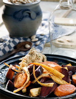 Geroosterde bietjes, winterwortel en pastinaak op witte bonenpuree Vegetarisch hoofdgerecht voor 4 personen