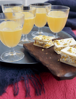 Smelt de chocolade in de magnetron of in een kommetje au bain-marie boven een pannetje kokend water. Wees voorzichtig, want witte chocolade wordt snel korrelig. Bekleed het bakblik met het bakpapier en giet er de chocolade op. Snijd de chocolade zodra deze is afgekoeld, maar nog niet helemaal hard is geworden in vierkantjes van 7 x 7 centimeter. Snijd de vierkantjes schuin doormidden zodat er driehoekjes ontstaan of maak nog kleinere vierkantjes. Laat de chocolade goed hard worden. Maal de piscachenoten fijn in een keuken-machine en roer er de roomkaas, de boter en de poedersuiker door. Besmeer de helft van de driehoekjes of vierkantjes met de pasta en dek ze af met de rest van de chocolade. Laat helemaal opstijven in de koelkast. Garneer even-tueel met de overgebleven nootjes.
