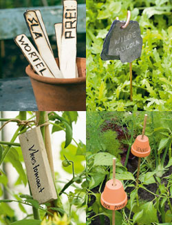 Leuk voor in de moestuin: maak deze labels! Werkwijze: Houten spanen Breek of zaag houten spanen uit een sinaasappelkistjes. Brand de tekst erop met een hete soldeerbout. Leisteen Koop een oude leistenen dakpan bij een handelaar in oude bouwmaterialen. Breek er een stuk af voor het label. Gebruik een griffel voor het schrijven van de tekst. Boor een gaatje in de leisteen. Buig een stuk ijzerdraad of lasdraad in een krul en hang er het leistenen label aan. Afval-latje Boor een gaatje in een houten latje en haal er binddraad doorheen. Terracotta potjes Zet aardewerken bloempotjes op hun kop op een bamboestokje. Schrijf de plantennaam op het potje met watervaste stift.