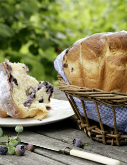 Spoel de bessen af onder koud stromend water en laat ze even uitlekken in een zeef. Spreid ze daarna uit op een laagje keukenpapier. Boen de sinaasappel goed schoon en rasp de oranje schil er dun af. Pers de sinaasappel uit. Zeef 300 gram bloem boven een kom en meng de gist erdoor. Schep daarna de geraspte sinaas-appelschil, kardemom, basterdsuiker en zout erdoor. Maak in het midden een kuiltje en breek de eieren erboven. Voeg de kwark met 50 gram boter en 50 milliliter sinaasappelsap toe en meng alles met de handmixer met deeghaken tot een samenhangend deeg. Strooi de rest van de bloem op het aanrecht en kneed het deeg tot het soepel en elastisch wordt. Druk het deeg tot een platte lap en strooi de bessen erover. Vouw het deeg in vieren en kneed de bessen er voorzichtig doorheen. Laat het deeg in een kom, afgedekt met plasticfolie, op een warme plaats 2 uur rijzen tot het volume is verdubbeld. Vet een briochevorm (een wijd uitlopende, gekartelde vorm) of een ronde ovenschaal in. Kneed het deeg voorzichtig door en vorm het deeg tot een ronde bal. Leg de deegbal in de vorm en laat het deeg op een warme plaats nog 1 uur rijzen. Verwarm de oven voor op 200° C. Schuif de vorm een richel onder het midden in de oven en bak het brood in 20 tot 25 -minuten goudbruin en gaar. Laat het brood in de oven 10 -minuten afkoelen. Neem het brood uit de vorm en bestrijk het direct met de rest van de boter. Bestuif het brood royaal met poedersuiker en laat het op een rooster verder afkoelen.