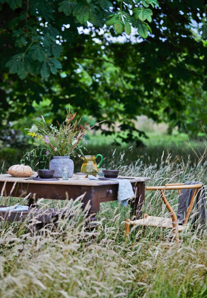 Dek je tafel in stijl met linnen servetten (stoerlinnen.nl, sostrenegrene.com), handgemaakt keramiek (rootfolk.com, loberon.nl) en glaswerk van de kringloopwinkel. Stoelen van bamboe of rotan zijn licht van gewicht en verplaats je dus makkelijk naar de beste plek. Een vaas met veldbloemen maakt het plaatje af.