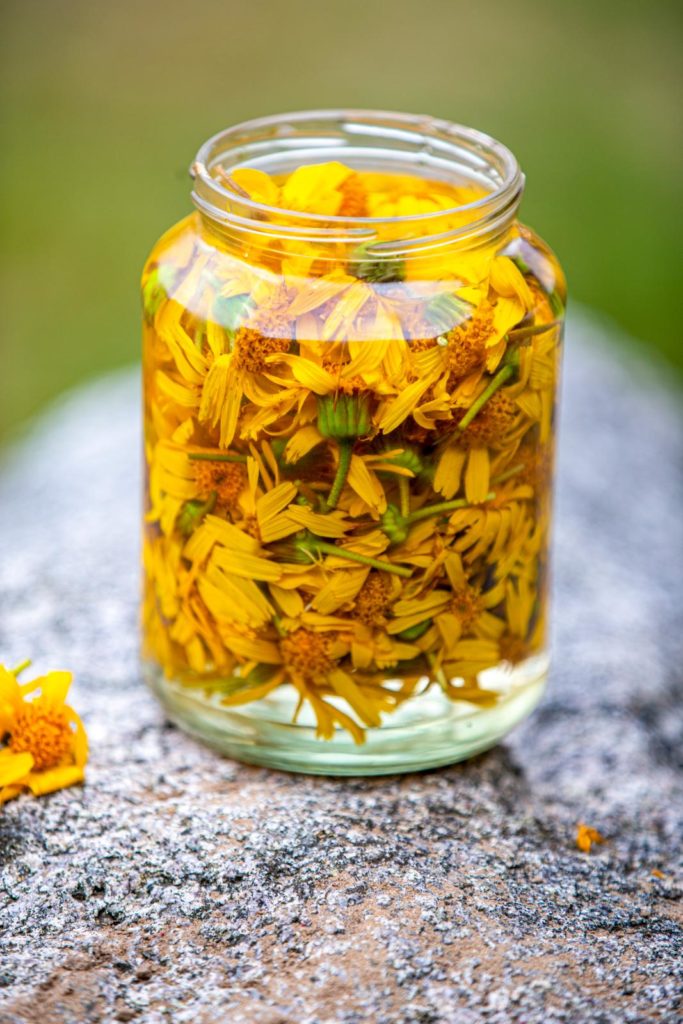 Van de honderdduizenden bloemen en planten die jaarlijks worden geoogst, gaat het gros naar klanten. Maar de kwekers houden ook een deel zelf voor eigen producten. âWe zetten de bloemen die we oogsten op olie in glazen potten in de volle zon. Zo kunnen de eigenschappen erin trekken. Na drie weken is de olie klaar. Het is een fijne massageolie voor pijnlijke botten en spieren. Van de wortels maken we zelf oertinctuur door de wortels zes weken lang op alcohol te zetten. En van die olie en tinctuur samen maken we dan weer onze Arnicazalf. Die is echt heel sterk omdat ze het beste van de plant combineren. En omdat we hier niet hoeven te bezuinigen op de inhoud.â