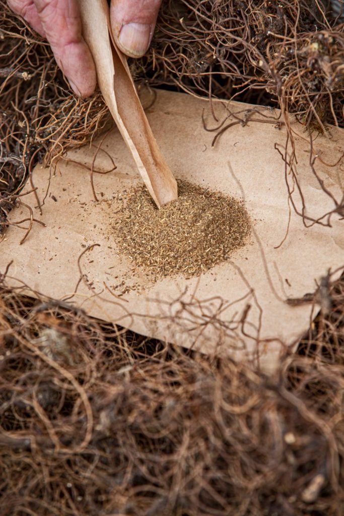 De Arnicakwekerij kweekt de oervorm van valkruid. Die is niet alleen het sterkst, maar heeft ook de grootste geneeskracht. De planten worden hier uitsluitend uit eigen zaad gekweekt om het gewas zuiver te houden. Voor het winnen van zaad laten de kwekers de bloemen in sommige bedden volledig uitbloeien. Zodra zich mooie pluizenbolletjes hebben gevormd, vindt de zaadoogst plaats. Dit gebeurt aan het eind van de dag, als het relatief windstil is. Het zaad gaat dan twee dagen de drogerij in. âHenk zaaide het direct uit over nieuwe bedden. Wij hebben inmiddels een kasje en het voortrekken van planten lijkt effectiever.â