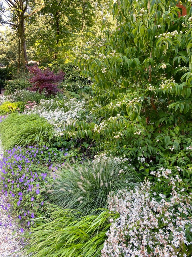 “De witte bloemen van de zevenzonenboom combineren mooi met bijvoorbeeld de witbloeiende Aster divaricatus en het rood aanlopende blad van Hydrangea quercifolia. Of juist samen met de koelblauwe Geranium ‘Rozanne’ en het golvende, frisgroene Japanse bosgras (Hakonechloa macra).”