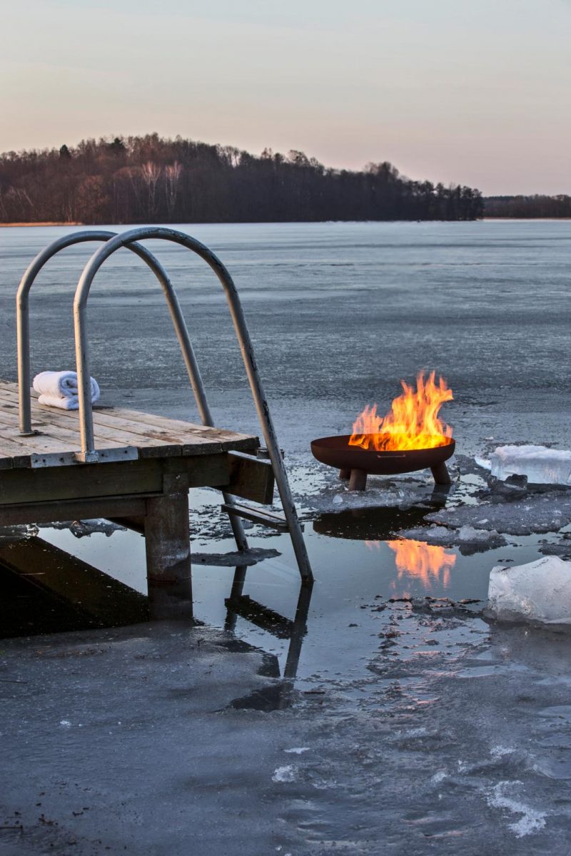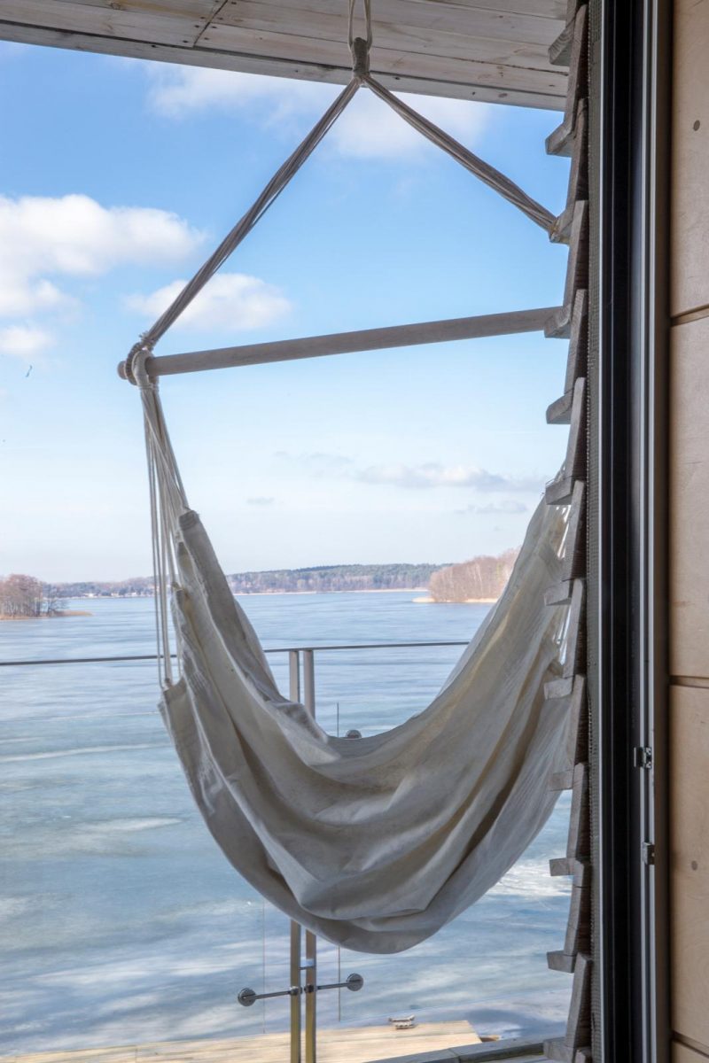 Zo bedrijvig als het hier in de zomer is met kano’s en zeilboten, zo ingetogen en betoverend is het hartje winter. Juist die verstilde sfeer maakt nieuwsgierig. Kale bomen geven kantachtige silhouetten in de lucht. Het hoogblonde riet steekt roerloos uit het ijs omhoog. De weidse, heuvelachtige omgeving vol bossen, meren en kastelen nodigt uit tot winterse wandelingen in knisperende stilte. De vaste zomergasten hebben hun traditionele houten datsja’s aan de oever en op de eilandjes in het meer vrijwel allemaal verlaten. Maar uit de schoorsteen van hotel Galery69 kringelt rook. Dit unieke, uit hout en glas opgetrokken hotel heeft breed en onbeperkt zicht op het meer. Het is het levenswerk van het Poolse kunstenaarsechtpaar MaƂgosia en Wojtek ƻóƂtowsky. Energiek en sportief als ze zijn, omarmen ze alle seizoenen. In de winter stoken ze de haarden hoog op, steken de houtkorven op het terras en de steiger aan en leggen wollen dekens en schapenvachten op de lage buitenbanken. Een heerlijke plek voor het eerste kopje koffie in de ochtend tot aan het moment dat de hemel roze kleurt van de ondergaande zon.