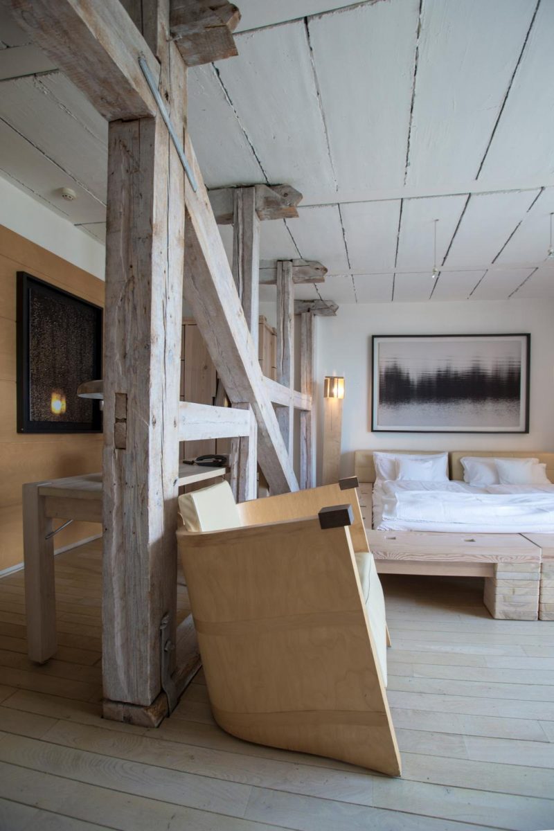 MaƂgosia en Wojtek kochten het hotel in 2000 puur om de wondermooie ligging. “Het ligt precies aan de goede kant van het meer, je hebt hier van ’s morgens tot ’s avonds zon”, aldus MaƂgosia. “In eerste instantie kochten we het hotel om er onze showroom van te maken. Het bleek ook een heerlijke plek om vrienden te ontvangen, dus hebben we het gebouw langzamerhand getransformeerd tot hotel. We hebben het uitgebreid met twee verdiepingen en grote veranda’s.” Het kunstenaarsechtpaar heeft alles in het hotel zelf ontworpen, zowel de meubels als de lampen. MaƂgosia: “Zoals je ziet houden we van krachtige maar simpele, zachte en afgeronde ontwerpen. De constructie houden we zichtbaar, ook de bouten en moeren zijn onderdeel van het ontwerp. In dit hotel werken we voornamelijk met glas, steen en hout. Een mix van industrieel en traditioneel. We gebruiken vooral douglasspar, berk en beukenhout, dat hier in de streek overal voorkomt. Om de massiviteit van het hout te doorbreken, beitsen we het zo blank en licht mogelijk. Het moet zacht en aaibaar blijven.” Andere Seasons-reizen in binnen en buitenland vind je hier. TEKST MARGRIET DE GROOT | FOTOGRAFIE PAULINE JOOSTEN
