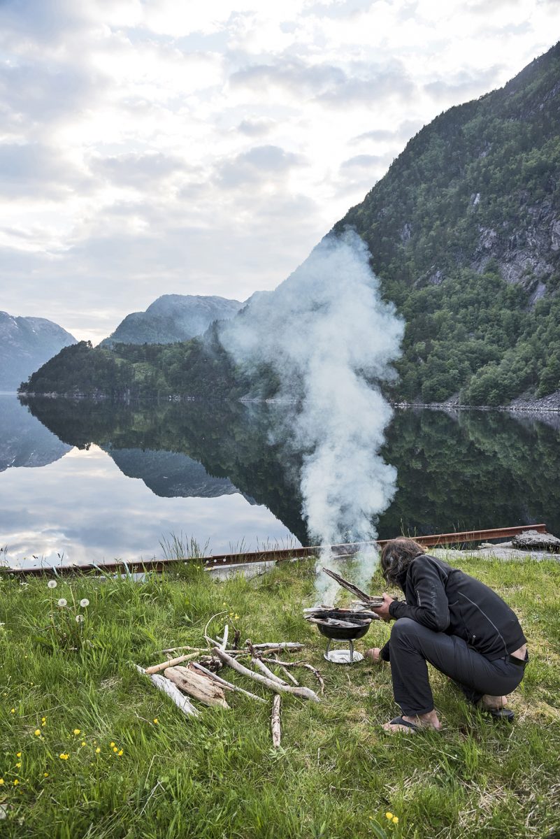 FLÅM Het dorp Flåm, aan de voet van de Aurlandsfjord, wordt omringd door besneeuwde bergtoppen. De Noren gaan er prat op dat hier het steilste spoor ter wereld loopt. Een tocht over de Sognefjord en Nærøyfjord bevalt me beter. De boot laveert tussen smalle doorgangen met metershoge steile rotswanden. Verlaten boerderijen balanceren op de rand van de klif, omringd door gezwollen rivieren die zich met donderend geraas van de bergflank storten. Ondanks het comfort van een kampeerterrein verkiezen we de vrijheid van het wildkamperen. Ons oog valt op een plek aan de rand van de fjord met een prachtig zicht op de bergen. Terwijl mijn reisgenoot drijfhout sprokkelt voor de barbecue, ga ik aan de slag in de kleine maar geriefelijke keuken.