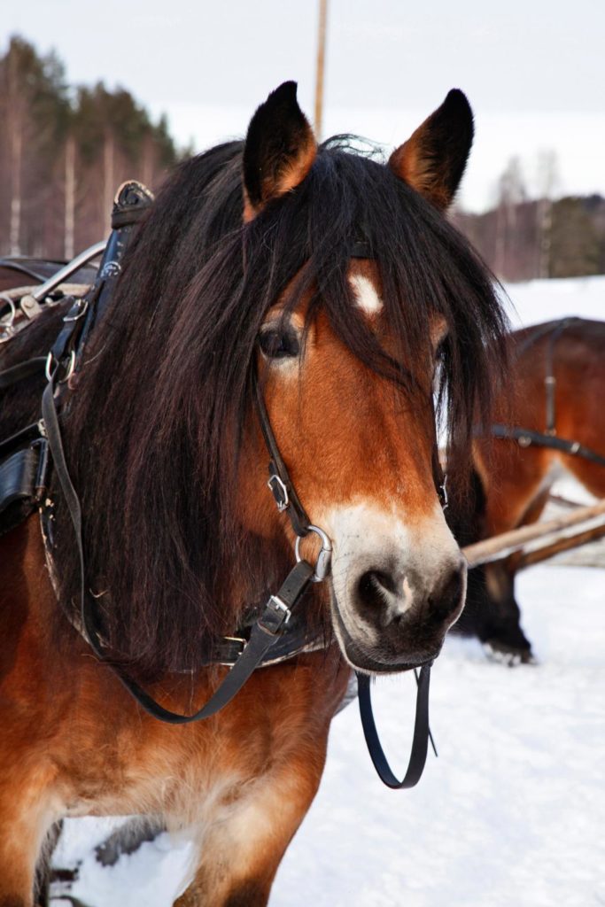 Elin wacht me op voor hun typisch Zweedse, rode houten huis. Op het besneeuwde erf staan de paarden. Wolkjes adem dampen uit hun neusgaten terwijl ze hun hooi eten. Het zijn Nordsvensk BrukshĂ€star, een oud werkpaardenras afkomstig uit het noorden van Zweden. Ze voelen zich prima op hun gemak in de sneeuw en kou. Elin: âHet zijn veelzijdige boerderijpaarden, niet heel groot, maar wel ontzettend sterk.â Eigenschappen die nodig zijn voor het werk waarbij de paarden vroeger werden ingezet, van akkers omploegen en werken in het bos tot helpen bij het hooien. Ook werden ze âs winters aangespannen voor de slee. âJe kunt dan geen wild of pittig paard gebruiken, ze moeten meegaand, gehoorzaam en wendbaar zijnâ, vertelt Elin.