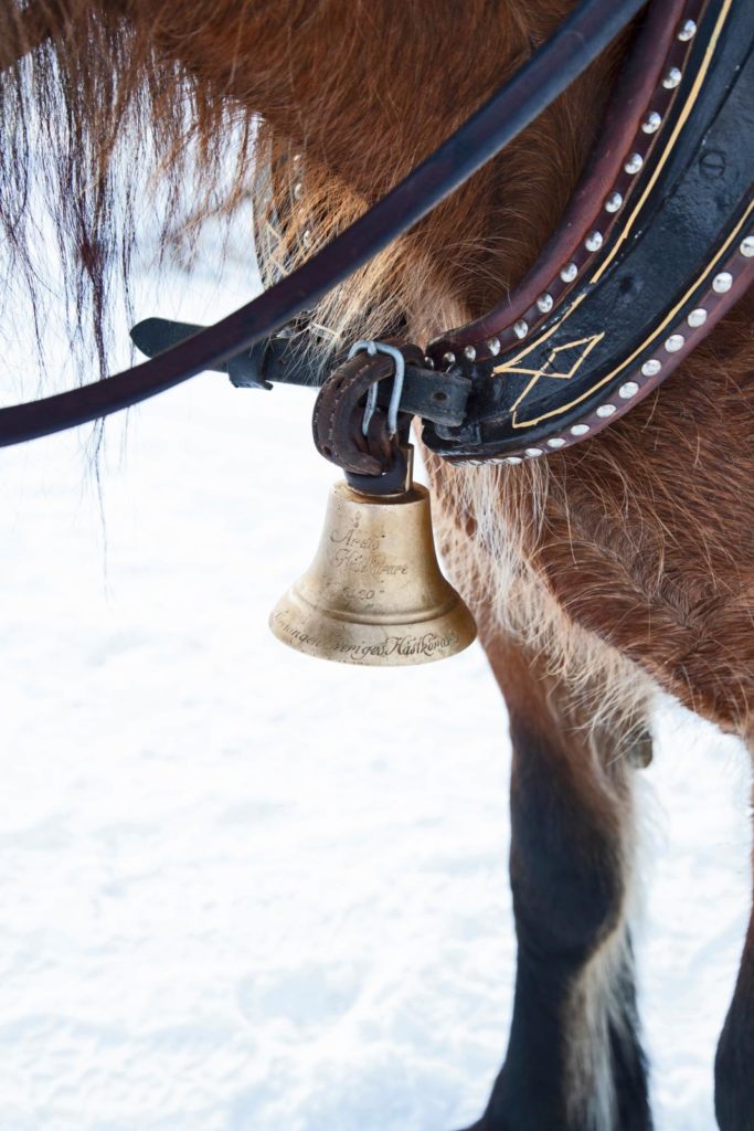 Twee prachtige, bruine paarden staan al op het erf aangespannen voor hun sledes. Hun gekamde zwarte manen en staart glanzen in de zon. âIk pak nog even de bel en dan kunnen we gaan.â Elin komt terug met een messing bel en hangt die op de borst aan het tuig van het voorste paard. âWe gebruiken de bel nu vooral omdat het leuk is, maar vroeger werd een bel in het bos bij het vervoer van boomstammen gebruikt. Kwam je met je paard met een vracht stammen het bos uit, dan had je voorrang op degene die met zân paard het bos inging. Door de bel hoorden ze je aankomen.â De paarden trekken de twee sledes over magnifiek witte bospaden. De messing bel rinkelt door de heldere winterlucht. Af en toe schijnt er een straal zonlicht door de bomen op het pad.