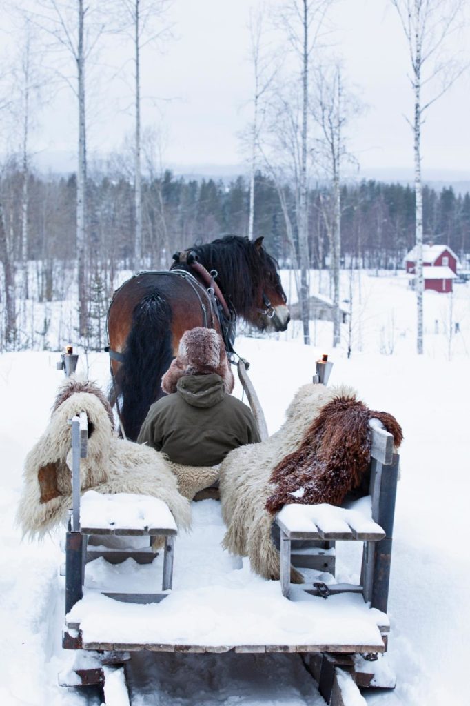 Aan weerszijden van de weg alleen maar dennenbomen, de takken buigen door onder een zware vracht sneeuw. Ik ben onderweg van UmeÄ in Noordoost-Zweden naar het dorpje Bjurholm. Deze regio, VÀsterbotten, staat bekend als een natuur-paradijs met zijn indrukwekkende bergen, valleien, meren en bossen. Mijn bestemming is Backfors GÄrd, de boerderij van Elin en Jonas Nordlund, zij organiseren hier sledetochten en paardrijtochten.