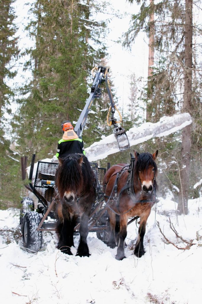 De volgende dag krijg ik van Elin de gps-coördinaten van de locatie waar Jonas aan het werk is. Ik stap in de auto en rijd over smalle, besneeuwde wegen door bossen, langs meren en door gehuchten met rode, houten huisjes. Na een uur rijden zie ik Jonas met een grote wagen vol boomstammen, getrokken door twee paarden uit het bos naar beneden komen. Met een kort ratelend geluid laat hij beide paarden stilstaan. Rustig leidt hij de paarden naar een open plek aan de weg en begint met het afladen van de boomstammen. Daarna gaan ze met een lege wagen weer de heuvel op het bos in. âDe paarden moeten optimaal luisteren als je dit werk doet, dat komt heel precies als je met een zware wagen vol boomstammen werkt op steile hellingen tussen de bomen. Als een paard dan niet goed luistert, kunnen er gevaarlijke situaties ontstaan. Toch werk ik liever met paarden dan met machines, je kunt gemakkelijker tussen bomen door manoeuvreren en bent flexibeler. En het is natuurlijk veel leuker om te doen en past beter in een natuurgebied.â