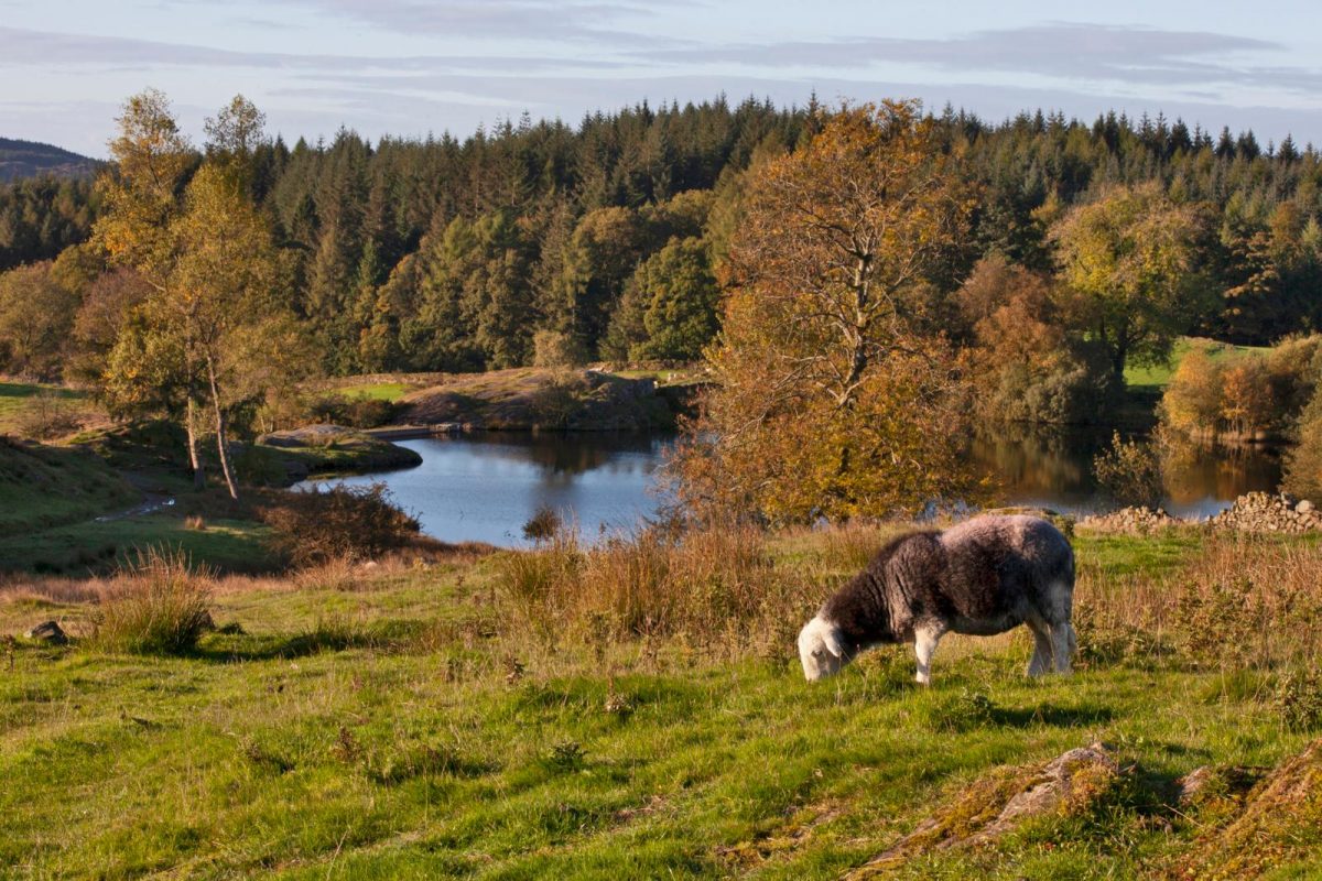 Een Herdwickschaap graast op de Lake District fells met het meertje Moss Eccles Tarn op de achtergrond.