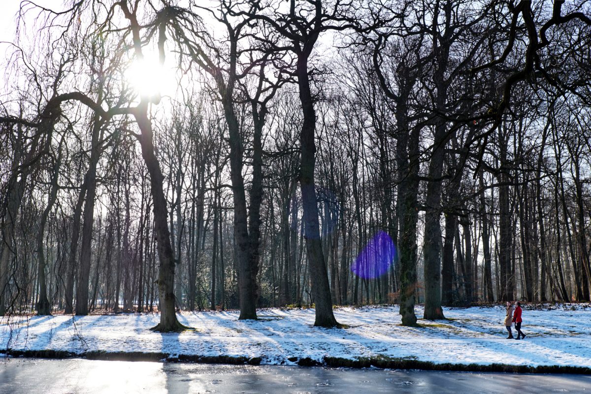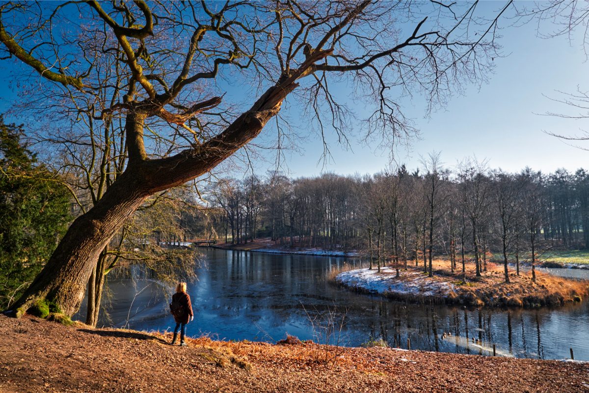 Aan de voet van de Wijnberg scharrelen eenden op het dunne ijs, een roodborst hopt van tak naar tak. Het bankje op deze heuvel staat precies goed. Niet alleen halverwege de rondwandeling, maar ook nog eens recht op het winterse zonnetje. En dus helemaal goed voor een korte pauze en een extra blik op de bomen van het landgoed. Groene- veld heeft nogal wat bijzondere bomen; de eigenaren plantten trompetbomen aan, gingko’s, moerascipressen en tulpenbomen in een tulpenbomenbos. En wie weet waren er destijds ook plannen om druiven te verbouwen. Dat zou een verklaring kunnen zijn van de naam Wijnberg, die ontstond na het graven van de vijvers. Een andere is dat de arbeiders na afloop van het zware graafwerk een kruikje wijn kregen.