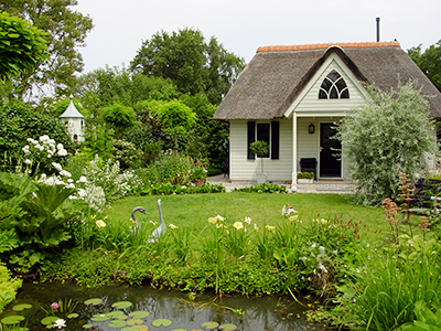 Friesland, Makkum Een tuin omringd door hoge hagen, met een vijver met spiegelend water en een sluimerbank om op te rusten en van de omgeving te genieten. Midden in deze 600m2 grote, romantische siertuin staat een tuinhuis waarin een comfortabel en sfeervol gastenverblijf is gemaakt. De serre biedt uitzicht op bloeiende bloesems in de hof. Aanrader is een bezoek aan een van de drie aardewerkbedrijven in het dorp Makkum. Trasmolen 35 8754 GL Makkum Friesland Nederland Tel: 0515 232172 metsspruyt@hotmail.com