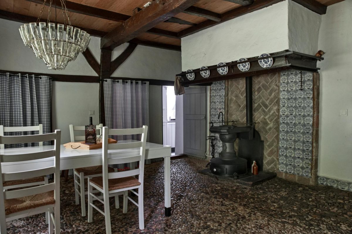 Eenmaal binnen voelt het of je terugstapt in de tijd. Een beetje dan, want Oud Vels is uiteraard van alle gemakken voorzien. Toch zijn het de historische details die het meest in het oog springen. De originele keienvloer in de voorkamer, de twee schouwen waarvan een met antieke tegeltjes en een oude stoof, de enorme balken… En dan, achter de geruite gordijnen, de eenpersoonsslaapkamers op de plaats van de voormalige bedstedes – even uniek als authentiek. Wat ook opvalt, is het contact met buiten. Via de grote glazen deuren kijk je op het ‘stilte-weitje’, waar je heerlijk kunt zitten. Ook staat er nog een bankje tegen het huis en een picknicktafel in het gras.