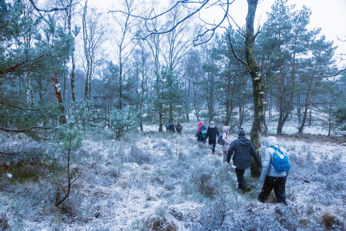 De sneeuw is langzaam overgegaan in ijskoude regen, die met bakken uit de hemel lijkt te komen, en de gebieden waar we doorheen trekken, worden steeds slechter begaanbaar. We houden even halt bij een stuk hei, waar natuurgids Den Ouden vertelt over de proef die hier twee jaar geleden werd opgestart. Door versnelde verzuring (die van de afgelopen 75 jaar komt overeen met 8.500 jaar natuurlijke verwering) worden er broodnodige mineralen onttrokken aan de bodem, waar met name de hei van te lijden heeft. Voorheen werd daarvoor geplagd en daarna kalk aan de bodem toegevoegd, maar plaggen is ingrijpend en kalk verdwijnt snel. Daarom zijn ze nu met een proef begonnen om steenmeel te verstrooien, dat z’n mineralen veel minder snel afgeeft.