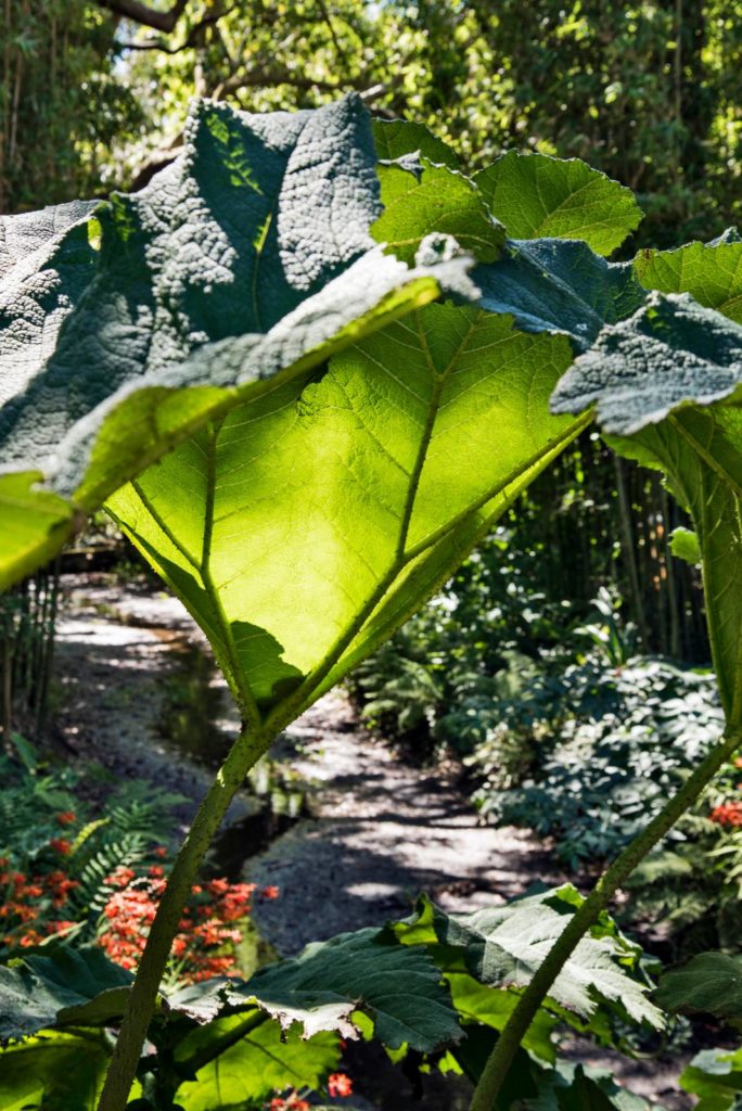 Ik begeef me naar de botanische tuin van Vauville, aan de rand van het gelijknamige dorpje met zijn authentieke natuurstenen huizen, omzoomd door rijkelijk bloeiende hortensia’s. Le jardin de Vauville is een buitenbeentje. In 1948 aangelegd door botanist en parfumeur Eric Pellerin en opgevolgd door zijn zoon Guillaume die een grote koeienweide in de loop der jaren wisten te transformeren in een botanische parel vol subtropische plantenpracht afkomstig uit het zuidelijk halfrond. Bamboesoorten, palmen, Tasmaanse reuzenvarens, eucalyptus en bladbehoudende heesters filteren het felle zonlicht op magische wijze.