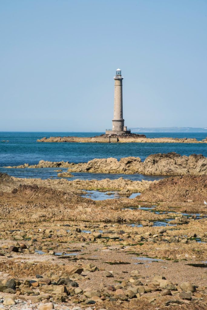 Onder een spinrag van touwen liggen in het minuscule haventje sloepen slagzij op de zeebodem, wachtend op het volgende hoogtij. Van hieruit loopt in oostelijke richting de wandelroute langs de baai van Quervière naar de kliffen van Landemer, het beginpunt van het langeafstandspad GR223, oftewel ‘le sentier des douaniers’. Voor mij lonkt de woestere westkant, die prat gaat op de hoogste klif van het Europese vasteland. Ik volg het kustpad dat langs weilanden met grazende koetjes en oude landerijen voert. Aangekomen bij de Phare du Cap Lévi, een vuurtoren op het uiterste puntje van de kaap, zie ik nóg een vuurtoren. De Phare de Goury rijst als een spitse fakkel uit zee op om in tij en ontij schepen weg te houden van de verraderlijke Raz Blanchard, een zes kilometer lange ondiepe onderwaterbarrage tussen het Franse vasteland en het Anglo-Normandische eilandje Aurigny, waarop in de loop der eeuwen menig schip te pletter sloeg.