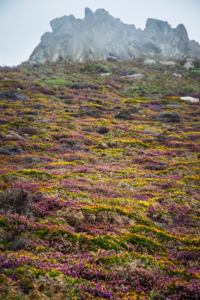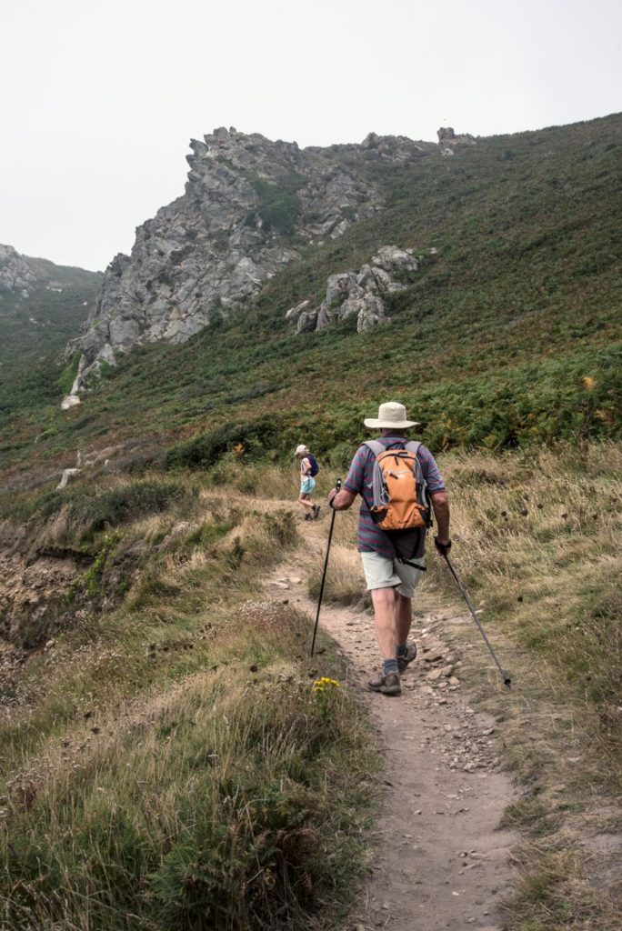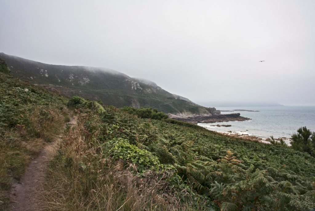 Voorbij de kaap slingert de Grande Randonnée 223 zich de hoogte in, naar de Baie d’Écalgrain. Ineens verandert het zacht glooiende landschap en het goed begaanbare wandelpad in een smal paadje gehold uit de steile heuvelflank. Ook de begroeiing is hier helemaal anders; de wuivende grashalmen, Roomse kamille en zongele boterbloempjes maken plaats voor een verwilderde oase van manshoge varens, stekelige distels, brem- en heideplanten die de heuvels inkleuren als een bont schilderpalet met dotten en vegen. Je hebt er niet veel verbeeldingskracht voor nodig om te bedenken dat dit eeuwenoude douanierspad de heimat was voor smokkelaars.