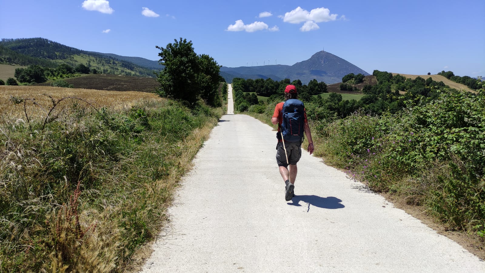 In Arrés wonen 43 mensen. Het gehucht ligt op een heuvel. Er is een kerk en een bar die het vooral van pelgrims moet hebben. Die pelgrims, waar zijn ze toch? De enige herberg wordt bestierd door twee vrijwilligers uit Barcelona. De nasleep van covid is ook hier merkbaar. Het handjevol wandelaars dat hier neerstrijkt voor een overnachting haalt bij lange na niet de maximale bezettingsgraad van twaalf bedden. Misschien draagt juist dat wel bij aan net dat beetje extra vandaag. ‘Buena energia’ zeggen ze hier – goede energie. Iedereen goedgemutst, een unieke onbevangenheid. We eten samen. Er komt Sangria op tafel, gekoelde vino tinto voor de liefhebber. Een jongen uit Cartagena heeft er al dertig etappes op zitten, de Japanse Atsuko pas drie, ikzelf tip trots de tien stuks aan. En dan is er Simon, een pensionado uit Zaragoza. Hij loopt van Canfranc naar Puenta la Reina. Gescheiden, twee zoons in het buitenland, en een Nederlandse vriendin met wie hij zijn liefde voor beeldende kunst deelt. Stok in de hand, Panama tegen het schelle zomerlicht. Hij is een schaduw op de achtergrond.