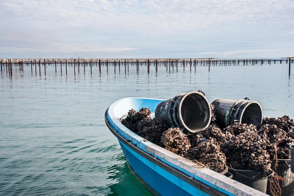 Ik tref Maria Nieves Castejon de la Fuente in haar werkplaats op de kade, waar ze me met een Zuid-Franse tongval enthousiast welkom heet. De Spaanse woonde en werkte als professor Frans in Madrid, tot ze trouwde met een Fransman dankzij wie ze in de oester- en mosselcultuur terechtkwam. Haar man is inmiddels met pensioen, zij bouwde samen met zoon Daniel de schelpdierenkwekerij uit. Niet alleen hebben ze een werkplaats aan het bassin en vier percelen in de mosselbaai L’Anse de Carteau, ze verwierven ook het biocertificaat voor hun teelt. Trots houdt ze me een joekel van een mossel voor. In vergelijking met de Nederlandse exemplaren is de schelp platter, breder en vooral groter. Zelfs een Jumbo of een Goudmerk moet het ertegen afleggen. “Dat mossels en andere schelpdieren hier bijzonder goed gedijen heeft alles te maken met de aanwezigheid van de Rhône”, verduidelijkt Maria. “Door de constante aanvoer van zoet water in het bassin hebben de getijden geen invloed en blijven de mossels permanent onder water. Bovendien bevat het rivierwater zeer veel voedsel, sporenelementen en kalk. In combinatie met het plankton van de zee komen de mossels hierdoor sneller tot ontwikkeling. Zo verkrijgen ze hun zachte, vlezige textuur en uitzonderlijke, gejodeerde smaak.”