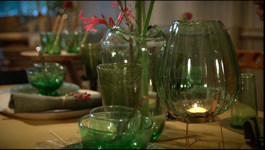 HK Living: houtenonderborden, 70’s groene bordjes Household Hardware: glazen soepkommen, kleine groene glaasjes Comptoire des objets: houten taartschaal Astrid Jeulink: servetten Polspotten: grote groene glazen House doctor: houten lepeltjes, glazen vazen, bestek Serax: grote waxine houders Dille & kamille: tafelkleed