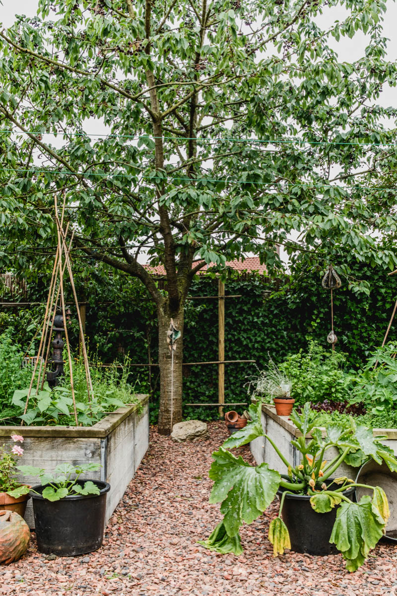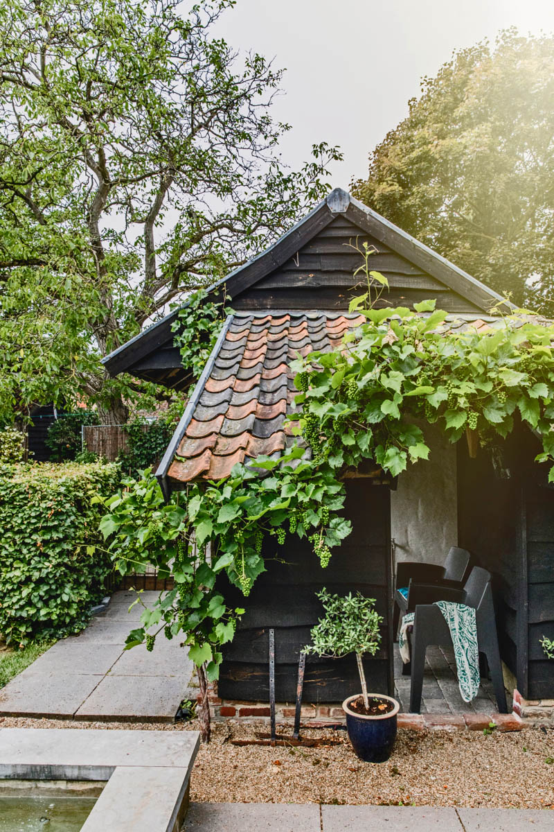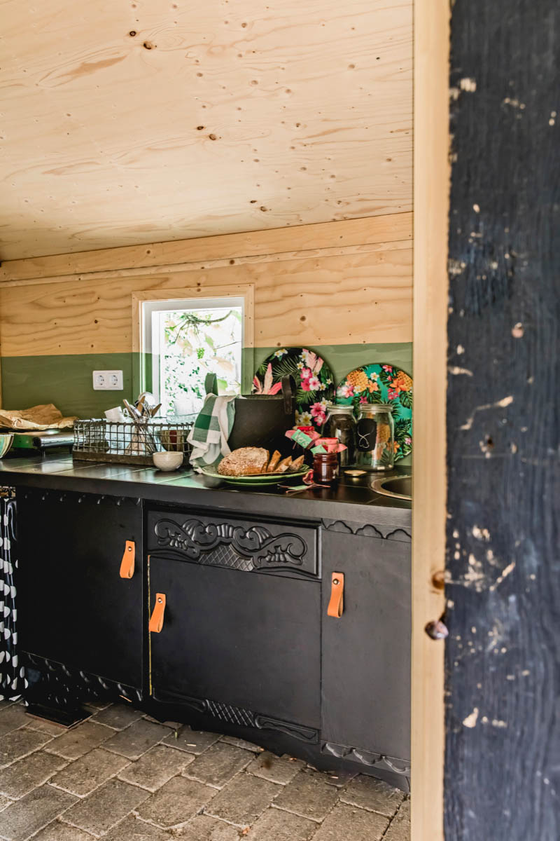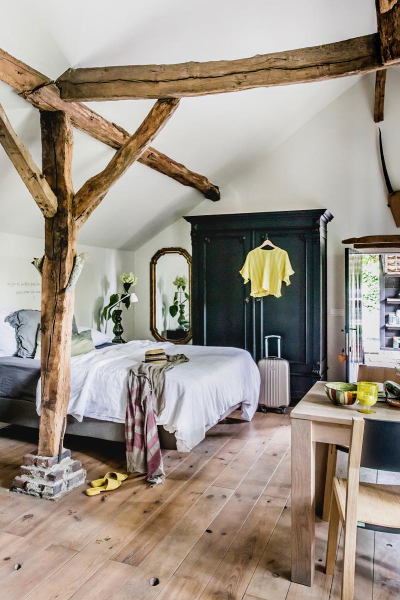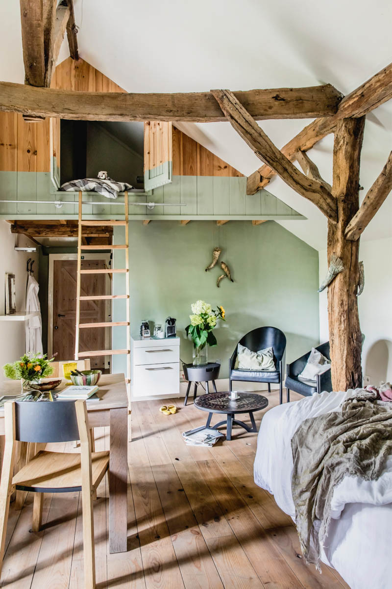 Toen de kinderen het ouderlijk huis verlieten, ontstond het idee voor een B&B in de kippenschuur. Bij de aankleding ervan borduurde Marilola voort op het stoere karakter van de oude schuur. Zo herhaalt de kleur zwart van de douglashouten gevel zich in een brocante kledingkast, geverfd met schoolbordkrijt. De originele buitenkeuken, gemaakt van een romantisch dressoir van de rommelmarkt, kreeg dezelfde matte finish. Bijzonder is ook de eikenhouten ontbijttafel met stoeltjes. Zoon Ruben, designer van beroep, maakte ze speciaal voor deze plek. In de grenenhouten nok maakte Jan een tweede slaapplek: een sfeervolle bedstee. Wie wil kan hier, via de ladder, ās avonds op stok.